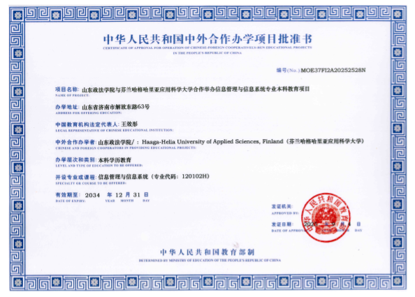 近日,教育部正式批复,同意山东政法学院与芬兰哈格哈里亚应用科学大学合作举办信息管理与信息系统专业本科教育项目,实现了学校中外合作办学项目新突破。