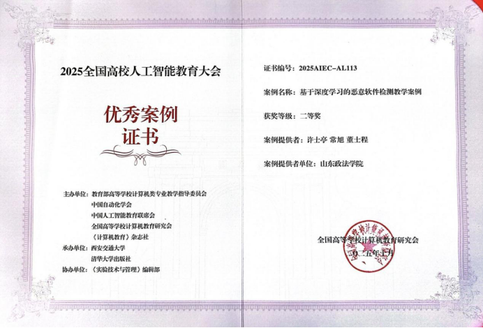 我院教师许士亭、常旭、董士程联合提交的《基于深度学习的恶意软件检测教学案例》荣获“优秀教学案例二等奖”。该案例结合人工智能与网络安全的前沿研究成果,探索了教学与科研深度融合的实践路径,展示了我校在人工智能教育与课程建设方面的积极探索与成效。