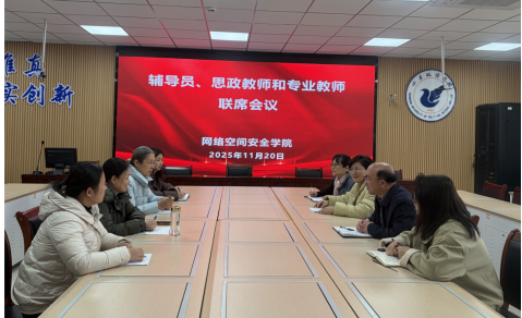 为深入贯彻落实立德树人根本任务,持续推进思政教育与专业教育深度融合,强化育人协同效应,11月20日,网络空间安全学院在尚德楼408会议室召开辅导员、思政课教师与专业课教师联席会议。学院党委书记刘振峰主持会议,思政课教师代表、全体辅导员及部分专业课教师参加会议。