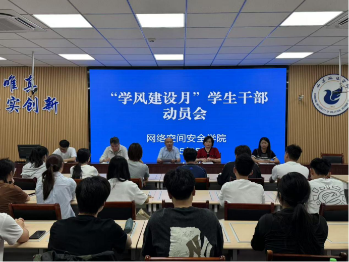 为全面贯彻落实立德树人根本任务,深入推进学风建设内涵式发展,营造奋发有为、昂扬向上的优良学风,5月14日,网络空间安全学院在尚德楼四楼会议室召开“学风建设月”学生干部动员会。学院党委书记刘振峰、全体辅导员及2024级全体学生干部参加会议。