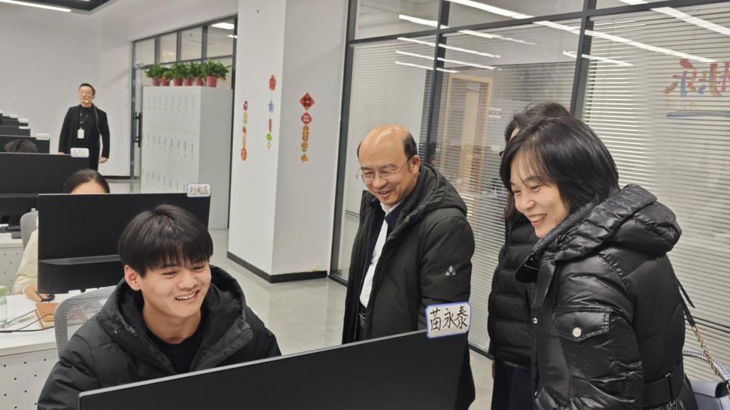 在济宁网易有道数字经济产教融合园,学院领导和教师观摩了学生在3D建模、数字工厂设备模型搭建等实训环节的实际项目,鼓励学生将课堂所学与产业实践结合,提升专业技能。